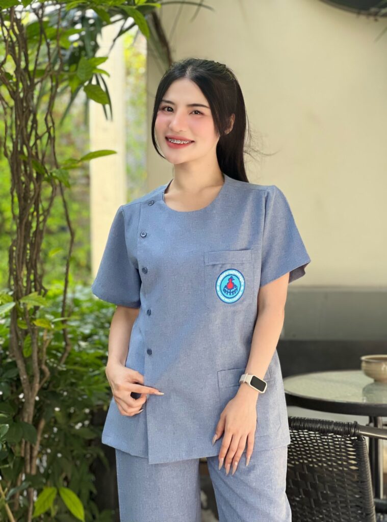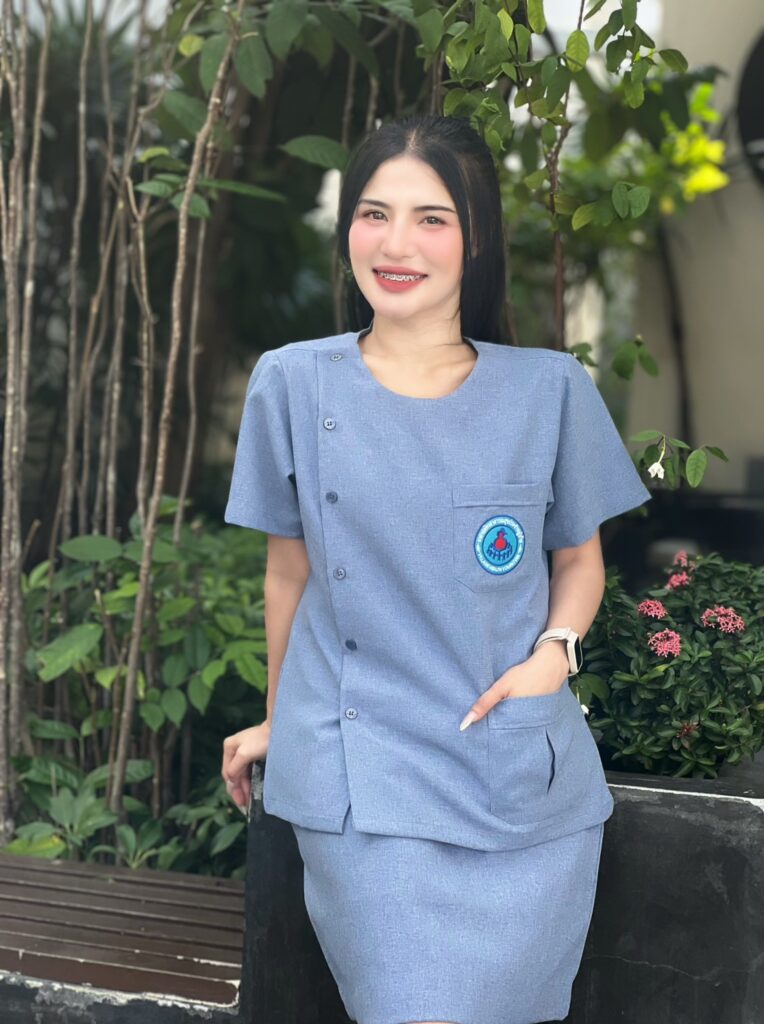– เสื้อทรงเข้ารูปนิดๆ พร้อมปักตรา อสม.ที่กระเป๋าขวา