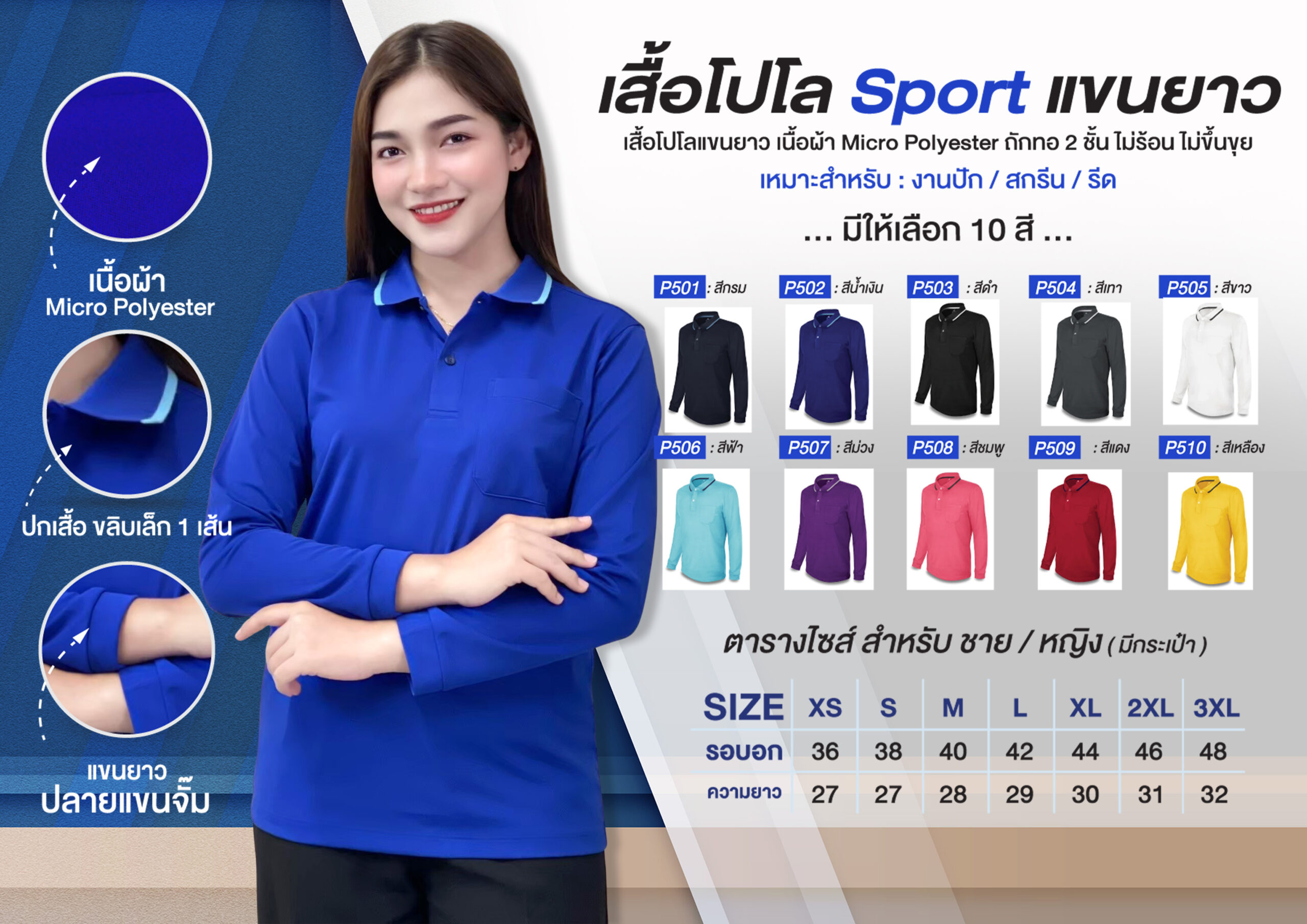 โปโลS C03 แขนยาว ผ้าไมโครโพลีเอสเตอร์ ถักทอ 2 ชั้น